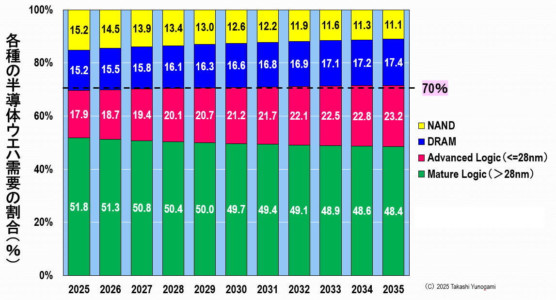 これを見ると、最も需要が大きいのは成熟プロセスであり、多少の減少は見られるものの、常に全体の50%前後を占めている。次に、先端プロセスのウエハ需要が徐々に拡大し、将来的には20%を超える規模になると予測されている。