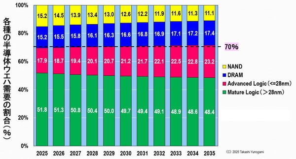 図5に示した各種半導体のウエハ需要について、各年の需要構成比を100%として再構成したグラフを図6に示す。