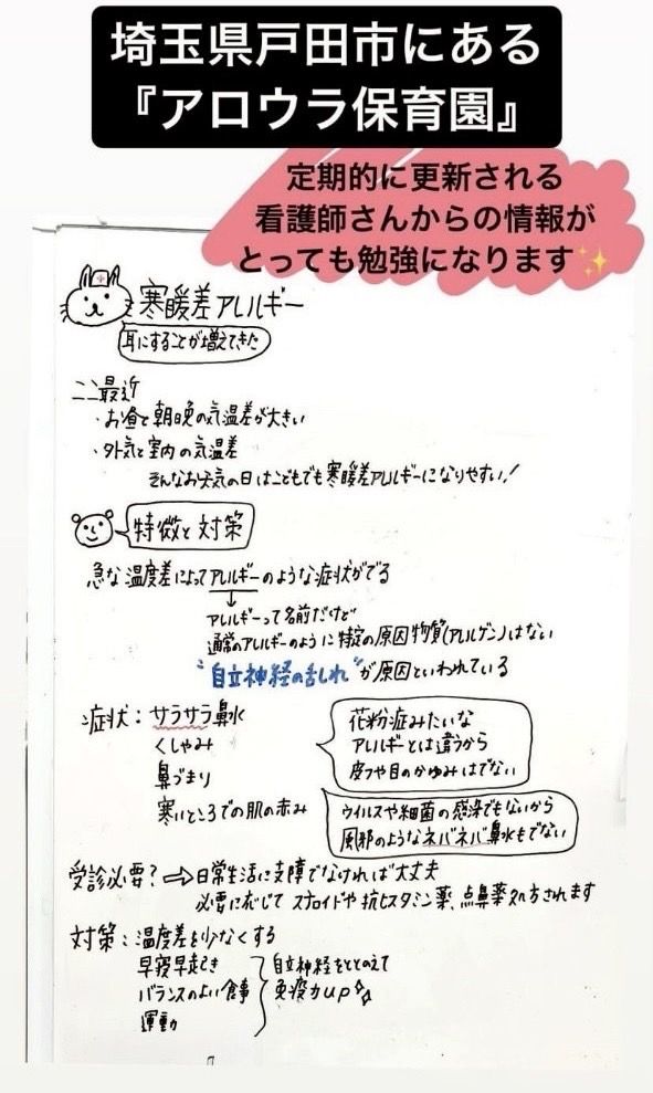 「保健だより」というのはどの園でもあると思いますが、視覚的に伝わりやすい掲示や状況に合わせた発信(職員と保護者で伝える情報を変えるなど)は一方的な発信で終わることなく、受け取った側が使える情報に変えることができる好例です。