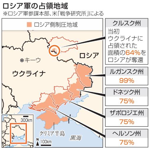 2022年9月末、プーチン氏はウクライナ本土の4州(ルハンスク、ドネツク、ザポリージャ、ヘルソン)を一方的に本国に併合すると宣言。ただし現時点でほぼ100%支配しているのはルハンスクだけで、残り3州はいずれも全土の約4分の3を軍事占領したにとどまる。
