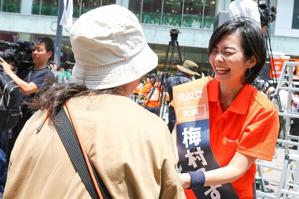 参院選で支持者と握手を交わす梅村みずほ氏 (写真:Pasya/アフロ)