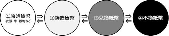 わが国では、奈良時代に銭が使用されるようになったものの、素材不足などの要因がはたらき、平安時代には使用が衰退している。むしろ生産量を増やせる布などの原始貨幣の使用に戻るという現象が生じた。つまり、図1に示したように、必ずしも通貨の仕組みが発展するように、①から②へと一方向に進むわけではなく、②から①へと逆流することもあったのである。