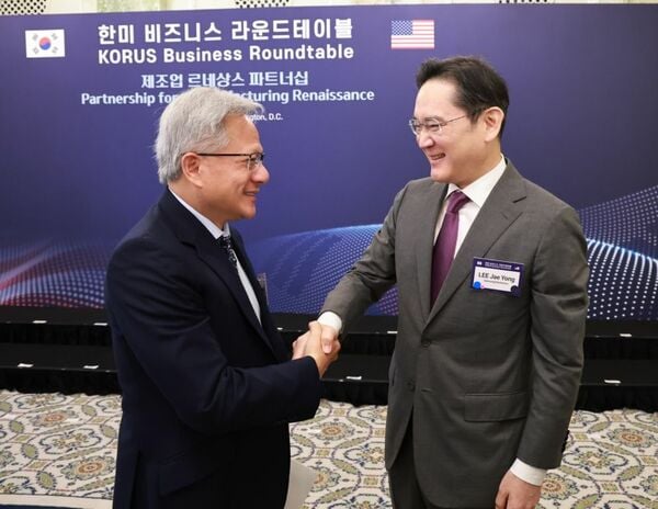 韓国の李在明大統領と一緒に訪米したサムスン電子の李在鎔会長と握手するNVIDIAのジェンスン・フアンCEO(8月27日、写真:YONHAP NEWS/アフロ)