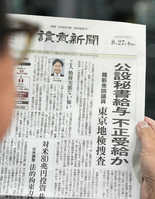 8月27日、読売新聞の朝刊1面のトップ記事は、「公設秘書給与不正受給か 維新衆院議員 東京地検捜査」という見出しで、当該議員として、「日本維新の会」の池下卓議員(50)(大阪10区)の名前が写真入りで記されている。しかし、その日の午前に、特捜部が家宅捜査を行った対象は、同じ維新の石井章参議院議員であった。