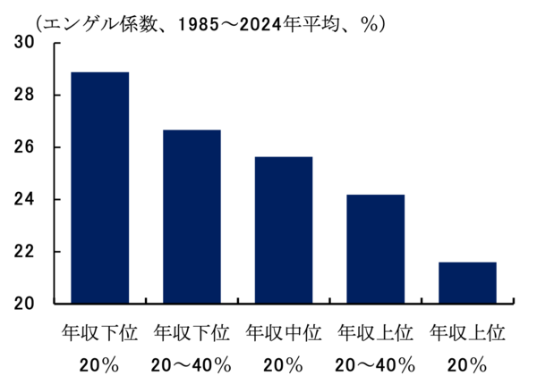 日本のエンゲル係数を「年収階級別」にみると、確かに年収階級が上がるにつれエンゲル係数が低下する形となっている(図表1)。つまり、エンゲルの法則は現代日本においても観察されており、エンゲル係数が「豊かさ」の指標としての機能を今でも有していることを示唆している。