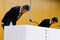 新浪会長の辞任について説明、謝罪したサントリーHDの鳥井信宏社長(左)と山田賢治副社長(2025年9月2日、写真:ロイター/アフロ)