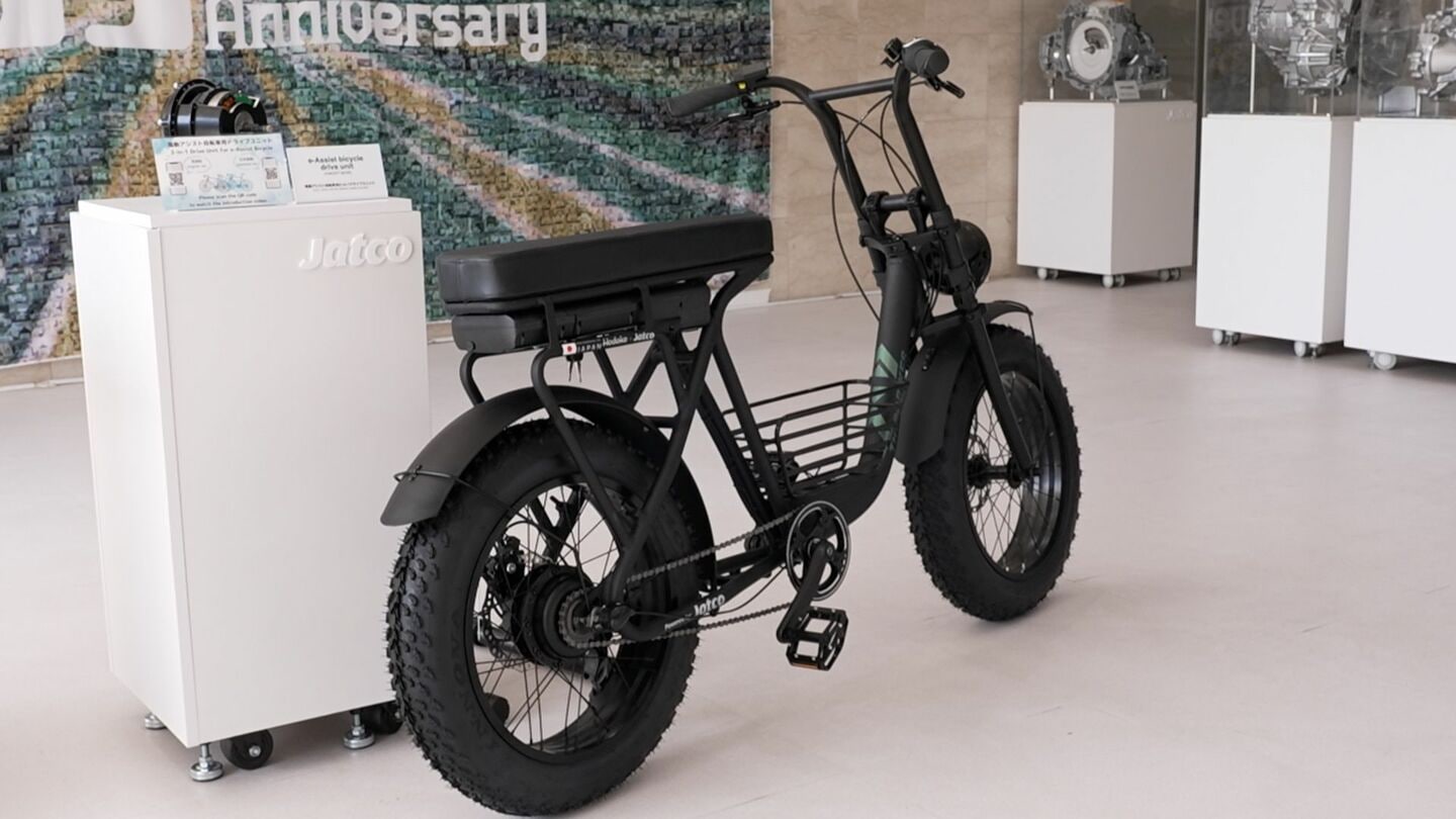 ジヤトコ製ドライブユニットを搭載した電動アシスト自転車のプロトタイプモデル。後輪車軸に変速機とモーターの2-in-1ユニットを搭載している(撮影:乙黒 恭平)