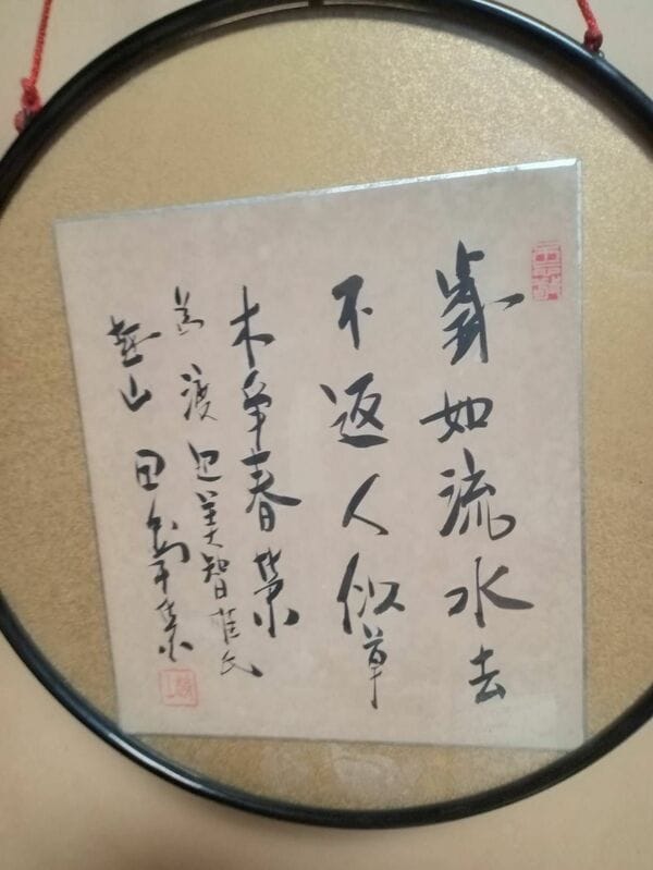 これは木戸孝允の自作の漢詩を田中角さんがしたためて私の父に贈ってくれた色紙である。「歳月は流水のように二度と帰ってこない。人々は春の草木が美しさを争うように、己の私利私欲ばかりを願いし、出世争いに走っている」という意味だと言う。