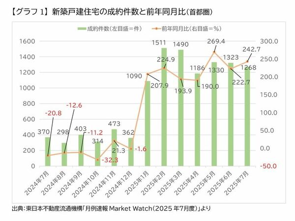 東日本不動産流通機構(東日本レインズ)のデータ(【グラフ1】参照)を見ると、首都圏の新築戸建住宅の成約件数は2024年7月に370件だったのが、2025年7月には1268件に増えている。前年同月に対して242.7%の増加で、およそ3.4倍に増えている計算だ。