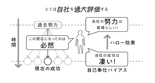 特に日本人の場合には、集団になったときにこれが強く働きます。集団奉仕バイアスです。自分の帰属する集団に強く愛着を持ち、ゆえにそれへの評価は甘くなります。自社の新商品が成功すればそれは自社が優れていたからだと思い、失敗すれば競合他社や流通・顧客・円高などの環境のせいだと思います。