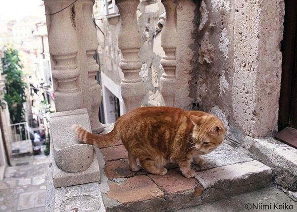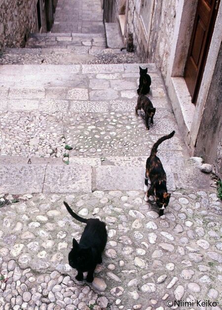 階段下を見ると、赤いクラシックタビーの後を追ってきたのか、シッポをふりながら楽しそうに猫たちが階段を駆け上ってきていました。民家が建ち並ぶ急な階段は、猫たちの遊び場所になっていました。
