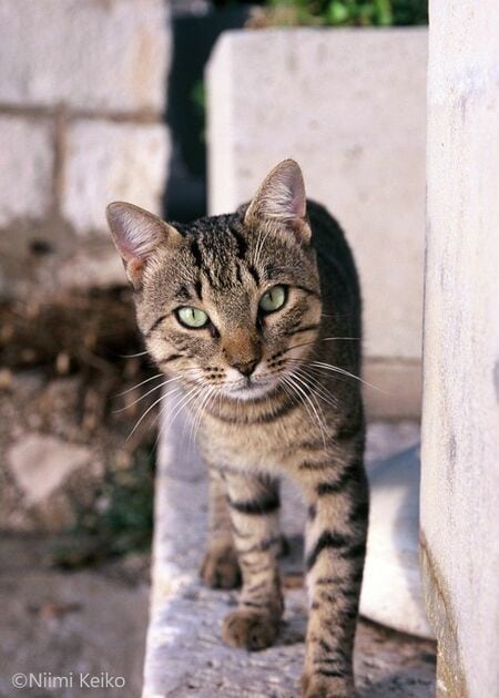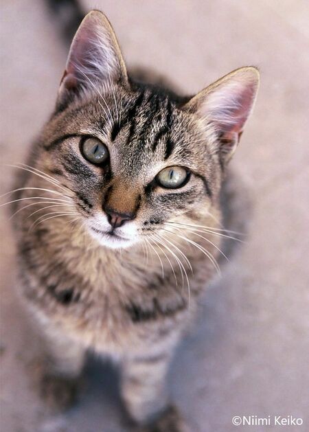 サバトラ猫にもたくさん出会いました。トラ猫は額に「M」の字があるので、そこに注目するのも楽しいものです。この猫の額には、Mの字というよりも天秤ばかりのような模様が浮かび上がっていました。