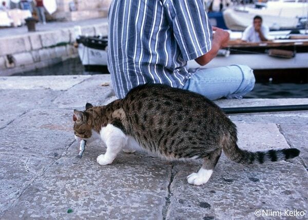 この猫は、釣り人の背中にピッタリと体をくっつけて寄り添い、他の猫が近づかないように厳しい目で見張っていました。男性の背中が動けば、それが竿を引き上げるタイミングだと知っていて、「魚をおくれよ〜」とゴッツンコしていました。魚をもらったとき、全身の毛の色がはっきりと輝いたように見えました。