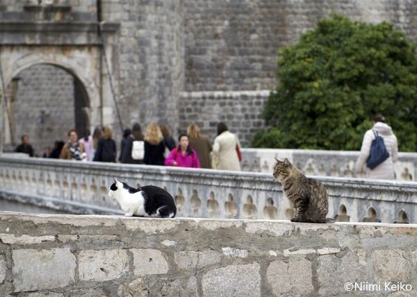 ドゥブロヴニク旧市街の表玄関ピレ門には、その昔、跳ね橋が渡されていました。街を守るために、日没後は跳ね橋が上げられて門を閉じていたのです。現在では固定された橋となり、早朝に通勤する人々を出迎える猫の姿が見られます。