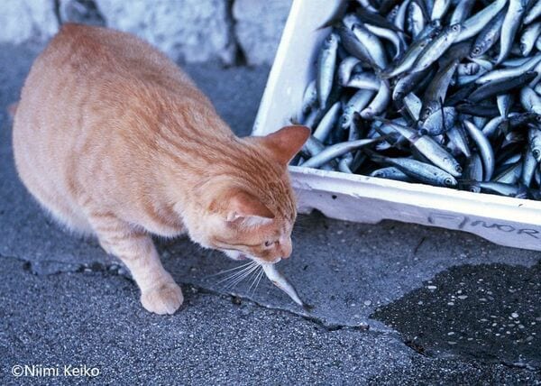 話がひと段落するのを待って、「赤トラ猫が、魚を食べていましたよ」と話しかけてみました。すると漁師さんは「それが何か? 猫たちは、いつも来ているよ。1匹の猫が10尾も20尾も食べるわけじゃなし。うちの魚が好きで食べているんだから、かまわないよ」。その話を聞いて、なんだか胸が熱くなりました。