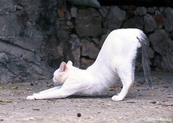 シッポだけが黒いオス猫は、ゆっくり歩いてきたかと思うと、立ち止まり、目の前できれいなノビをしてくれました。