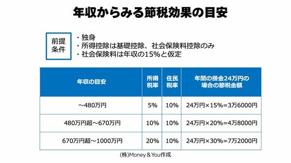 頼藤:40〜50代になると年収が上がり、所得税・住民税の負担も大きくなるため、iDeCoによる節税メリットが際立ちます。例えば年収800万円の人がiDeCoで月2万円を拠出すると、年間で7万2000円の節税につながります。