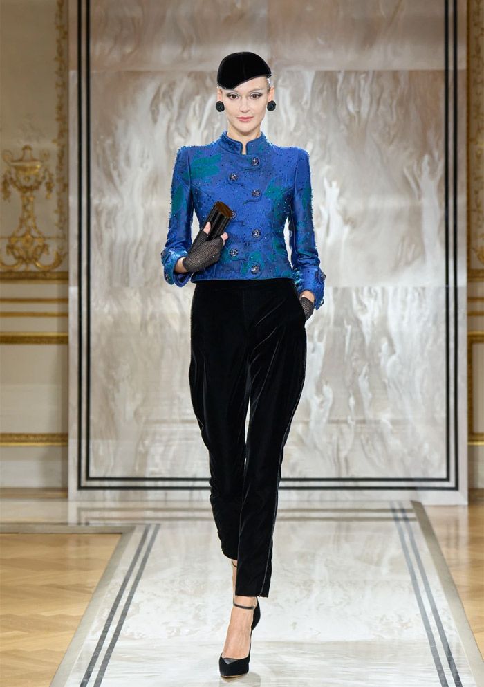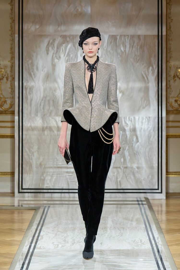 シニョンの髪に小さなベレータイプのハットを乗せ、凛としていてエレガントなスタイルです。トップスには刺しゅうやレースなどゴージャスで繊細な生地を使い、全て黒のパンツを合わせています。最近のアルマーニコレクションは同素材のスーツは少なく異素材で組み合わせた着こなしが主流です。