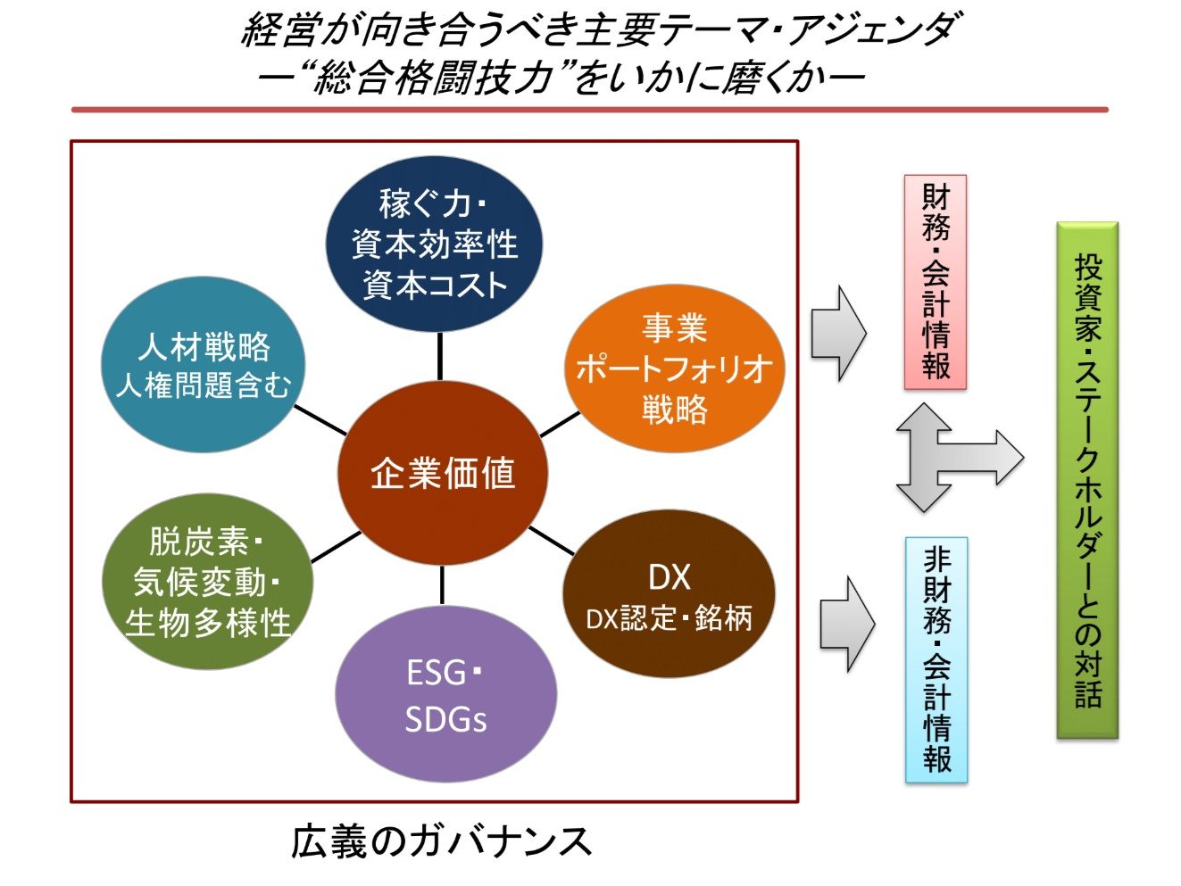 経営が向き合うべきテーマは年々増えています。具体的なテーマには、「稼ぐ力・資本効率性」「人材戦略・人的資本経営」「脱炭素・気候変動・生物多様性」「DX」「ESG・SDGs」「事業ポートフォリオの最適化」といったものがあります。