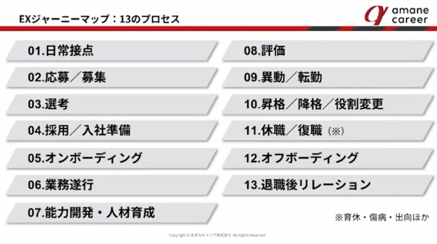 EXジャーニーマップは、採用前から退職後までのEXの全体像を13のプロセスに分け(下図)、それぞれについて半径5m以内の従業員体験も含めて体系化したものです。
