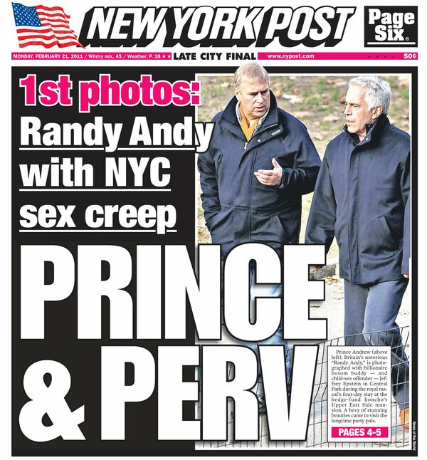 2011年2月21日、ニューヨークポストは一面でアンドルー王子と性犯罪者ジェフリー・エプスタインの関係を取り上げた。タイトルは「王子と変態」(写真:Splash/アフロ)