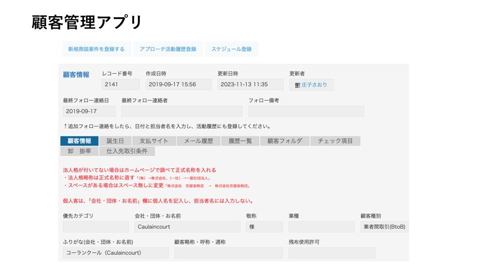 蜂谷 最初に作ったのは「顧客管理アプリ」「販売管理アプリ」「受注管理アプリ」の3つでした。例えば顧客管理アプリでは、お客さまの基本情報とメール履歴、過去の取引の見積もりや商品デザインを紐付け、一元的に見られるようにしています。これにより、社員はそれまでのように各所から情報を集めなくても、お客さまデータにアクセスすれば、ワンストップで状況を把握できる環境が整いました。なお、このアプリは私が土台を作り、その後、現場の社員がブラッシュアップしていきました。