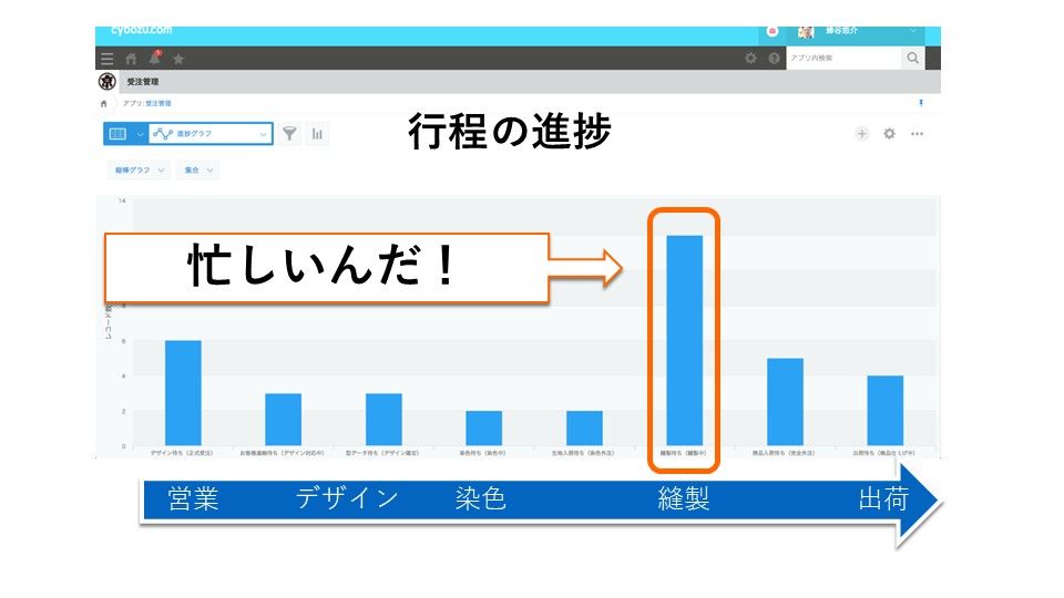 受注管理アプリでは、案件ごとの進捗状況も可視化しています。そのデータを合計し、今どの工程にどれだけのタスクがたまっているかも分かるようにしました。特定の工程に集中しているタスクを消化しなければ取引全体に支障が出るため、このシステムを見て、他部門の社員が自主的にフォローする動きが生まれてきました。