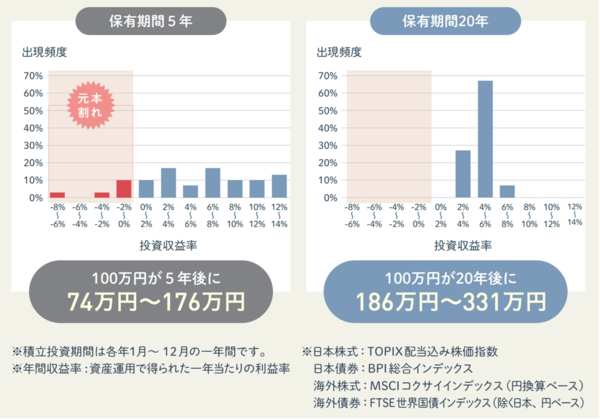 積立・分散投資の期間が5年だと投資収益率にバラつきがあり、時期によって損失が出ていることがわかります。しかし積立・分散投資を20年した場合は元本割れがなく、年率2〜8%で増やせていることがわかります。