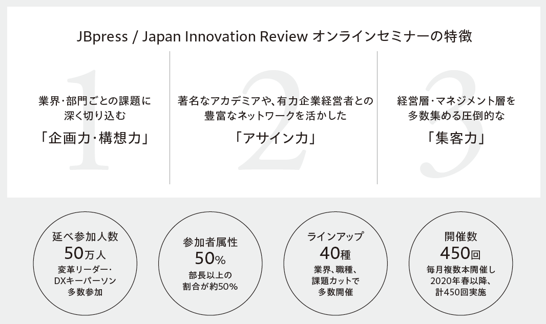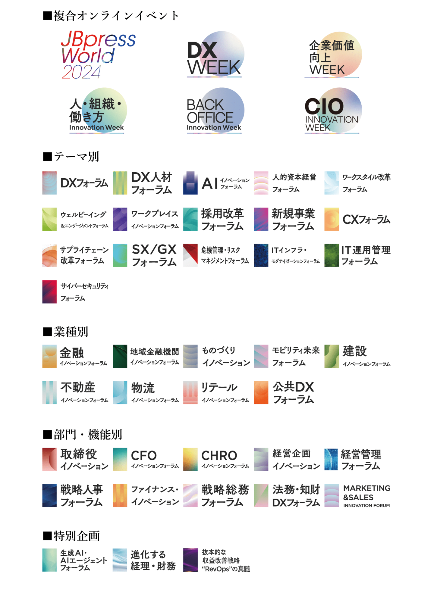 JBpress/Japan Innovation Reviewが展開するセミナーシリーズのラインアップは約40種類。「テーマ別」「業種別」「部門・機能別」に細分化し、年間150日以上開催している。