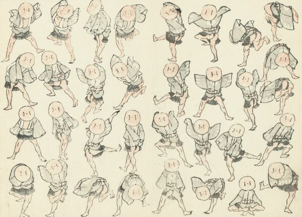 『北斎漫画』全15編には3千数百の図版が掲載されている。人物の表情の描き方、ポーズのつくり方に加え、動物、鳥、昆虫、植物、さらには幽霊、妖怪の類など、森羅万象あ