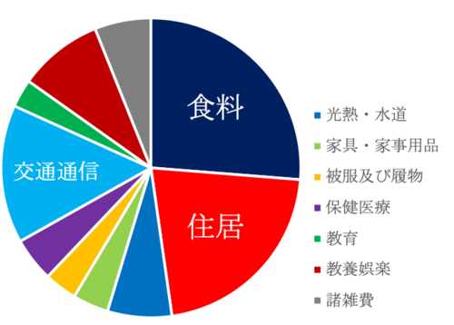 言うまでもないが、家賃上昇は賃貸住宅で暮らす家計(筆者もその一人である)にとっては困ったことである。家計支出を10分類に分けた際、最もウエイトが大きいのは「食料」だが、それに次いで大きいのは家賃が大部分を占める「住居」である(図表2)。