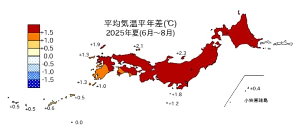 図中の数字は平年差(℃) 出典:気象庁「2025年夏(6月〜8月)の天候」