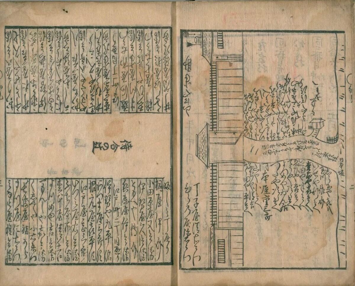 そんな重三郎も最初から何から何まで順風満帆だった訳ではありません。安永2年(1773)、新吉原に書店(耕書堂)を営むことになりますが、当初は老舗大手の版元・鱗形屋(孫兵衛)が毎年発刊する『吉原細見』という書物の卸し・小売の仕事をしていました。『吉原細見』とは吉原の遊女屋やそこに属する遊女、その揚代金などを記した「吉原の総合情報誌」とも言うべき冊子です。
