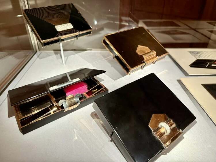 第三章「モダニズムと機能性」では、幾何学的な形と機能的な美しさを兼備する、モダニズムを感じるジュエリーやアクセサリーが披露される。中でもユニークなのは「ミノディエール」。一見、貴金属製のクラッチバックのようなケースなのだが、内部の仕切りが工夫され、鏡、パウダーケース、口紅、ライター、タバコ、ピルケース、櫛などを整理して収納できるようになっている。生活の小道具にまでアートとしての息吹が宿る、これぞ実用芸術。