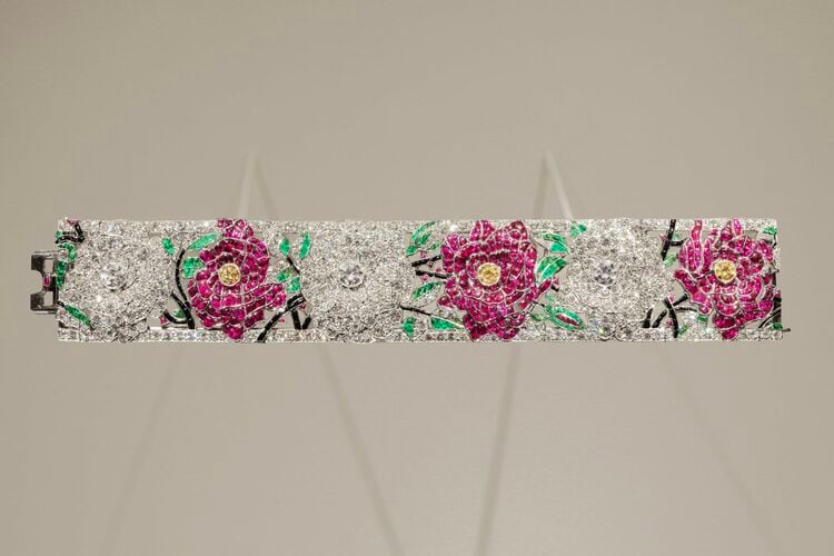絡み合う花々、赤と白のローズ ブレスレット 1924年 プラチナ、エメラルド、ルビー、オニキス、イエローダイヤモンド、ダイヤモンド © Van Cleef & Arpels