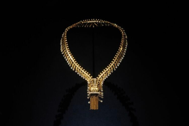 第四章「サヴォアフェールが紡ぐ庭」。ここでは匠の技によって表現された花や動物に着想を得たジュエリーによって色鮮やかな庭園の情景が広がる……というコンセプトなのだが、私の目が釘付けになったのは、花ではなく、ジップ(ファスナー)をモチーフにした《シャンティイ ジップ ネックレス》(1952年)であった。これは、かのウィンザー公夫人ことウォリス・シンプソンのアイデアとリクエストがきっかけで誕生したものなのだ。