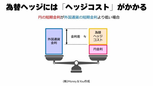 そして最後が「為替ヘッジ型」です。ヘッジとは値動きの影響を抑える仕組みのことですが、為替をヘッジするのにもコストがかかります。このコストは円金利と外国金利の金利差。足元で円金利は上昇してきているものの、外国金利と比べると低く、ヘッジコストは高額です。