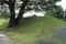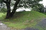 主郭から見た北郭。手前の凹みは堀跡。北郭は馬出のような機能を果たす縄張りになっている