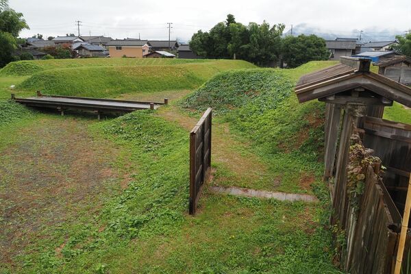 土塁で厳重に防備された主郭の内部。発掘調査で見つかった建物や井戸の跡がわかりやすく表示されている