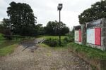江上館跡の入口。詳細な説明板が設置されている。画面左奥に堀と土塁が見える