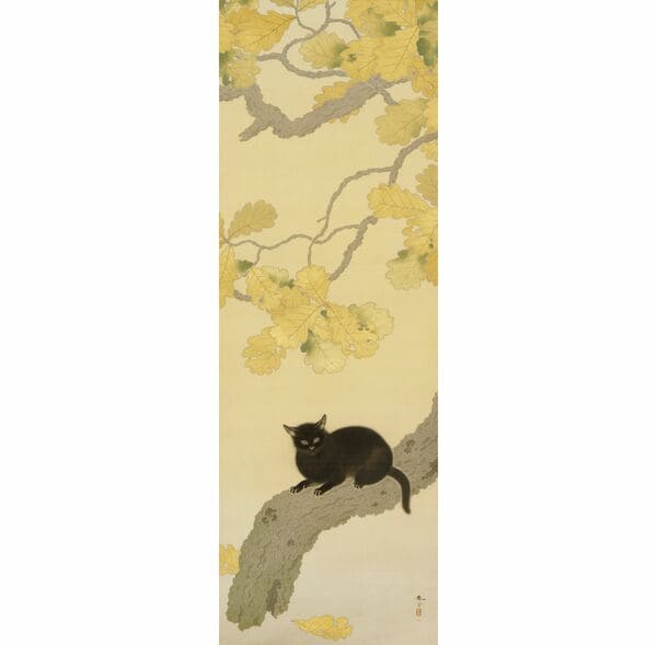 墨のぼかしによって表現された、思わず触れてみたくなるような柔らかな毛並み。「猫が描かれた日本画」と聞いて、永青文庫所蔵の菱田春草《黒き猫》を思い浮かべる人は多いのではないか。2014年に東京国立近代美術館で開催された菱田春草展では「近代日本画でもっとも有名な猫」と紹介されていた。対抗馬、いや“対抗猫”がいるとすれば、山種美術館所蔵の竹内栖鳳《班猫》あたりだろうか。