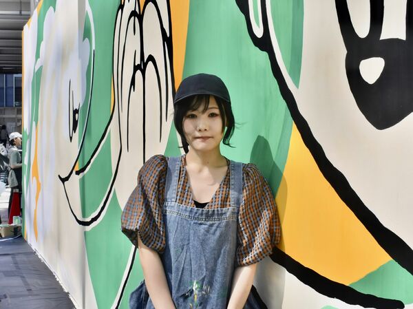 アーティストらが使用した絵の具は、耐水性のアクリル絵の具「スクールガッシュ」。交通量の多い江戸桜通りのビル建設現場の仮囲いをキャンバスとした北林みなみさんは、複数色の絵の具をタッパーで混ぜて使用し、トロピカルな雰囲気の森と架空の生きものを描いた。時折、クラクションがけたたましく鳴るなか、「いろいろな人の目に触れる場所なので、とにかくポジティブな気持ちになるようにしたいと考えました」と話す。