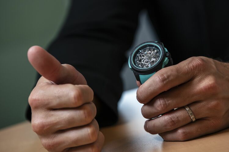 なかでも『ワイルドワン スケルトン 39mm』は非常に目立つ存在だ。ケース、ベゼル、インデックス、針、そしてストラップにカラフルなカラーを効果的に使用することで、華やかさとスマートさを演出。トビアス副社長のようなジャケットスタイルでも違和感がなく、しっかりと馴染んでいる。