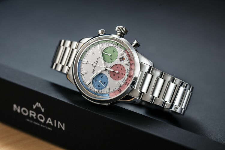 カラフルなモデルが多いノルケインだが「スイス機械式時計文化の継承」というミッションを掲げているだけに、伝統的なスイス時計の要素がベースになっているのは言うまでもない。その象徴的なモデルが『フリーダム』。シンプルでオーセンティックなクロノグラフモデルに、インダイヤルにポップなカラーが施すという遊びを入れている。