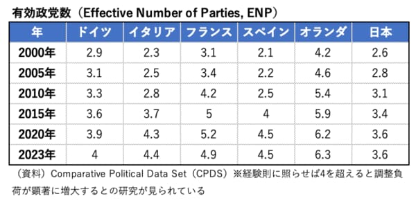 政治学の世界には「有効政党数(ENP:Effective Number of Parties)」 と呼ばれる指標がある(各党の議席占有率の2乗を合計した値の逆数で算出)。数字が大きいほど議会の分裂度が大きいことを示しており、先行研究では「4を超えれば議会における調整負荷が増大し、政権の持続期間も短くなる」という指摘がある。