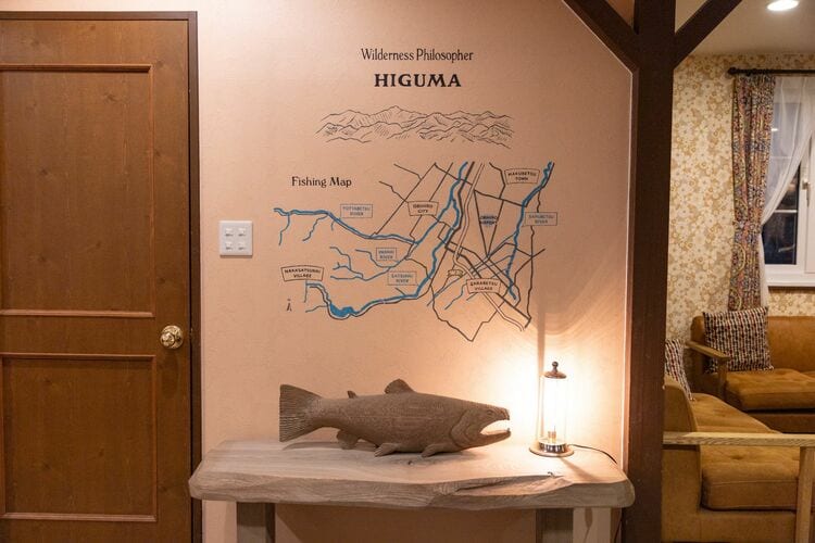 木彫り作家 佐藤憲治の作品がそここに飾られる「ヒグマ」棟。鮭の置物の後ろの壁には周囲のフライフィッシングポイントの地図が描かれている