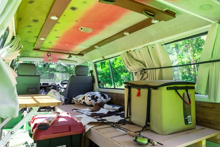 ニジマス柄の天井にはロッドを格納できる。簡易テーブルつきで車内で動画編集することもあるという