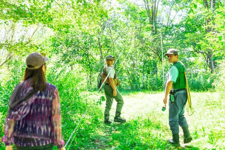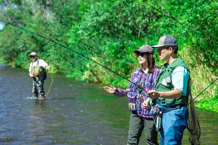 もはやベテランといった雰囲気のRISAさんがフライフィッシングの先生役もしてくれた。ちなみに手前の宮本さんが装備しているフライフィッシング関係の道具はフェーリエンドルフにてレンタルしたもの