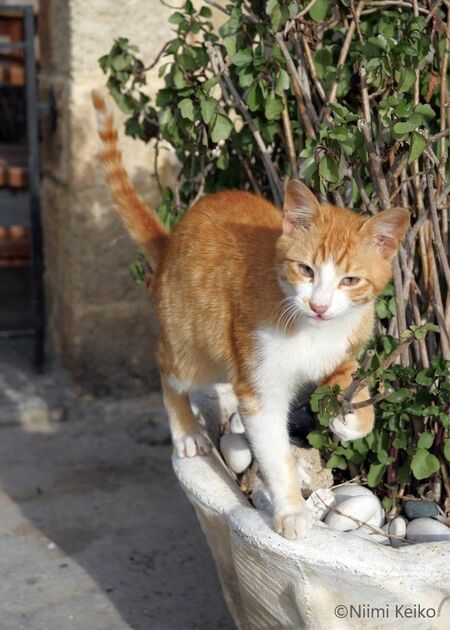 住宅街の広場にあるレストランです。中央にかまど跡のような枠が残されていました。その上に乗っていた猫は、背中をなでてほしかったのか、猫背を強調するように頭を下げて、じっとこちらを見つめました。
