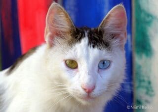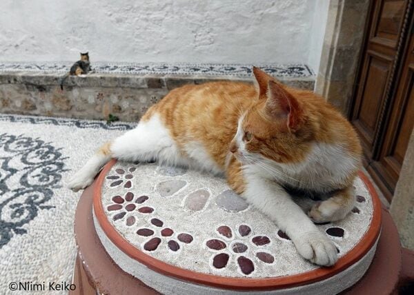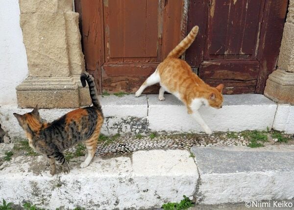 この2匹は、恋人同士といった感じで、仲のよいところを周りに見せつけていました。トラ猫がオスで白黒はメスです。体を寄せ合いゆっくりと歩いて、互いにゴッツンコの交換。近くにいた観光客も、とても微笑ましいと口々に話していました。